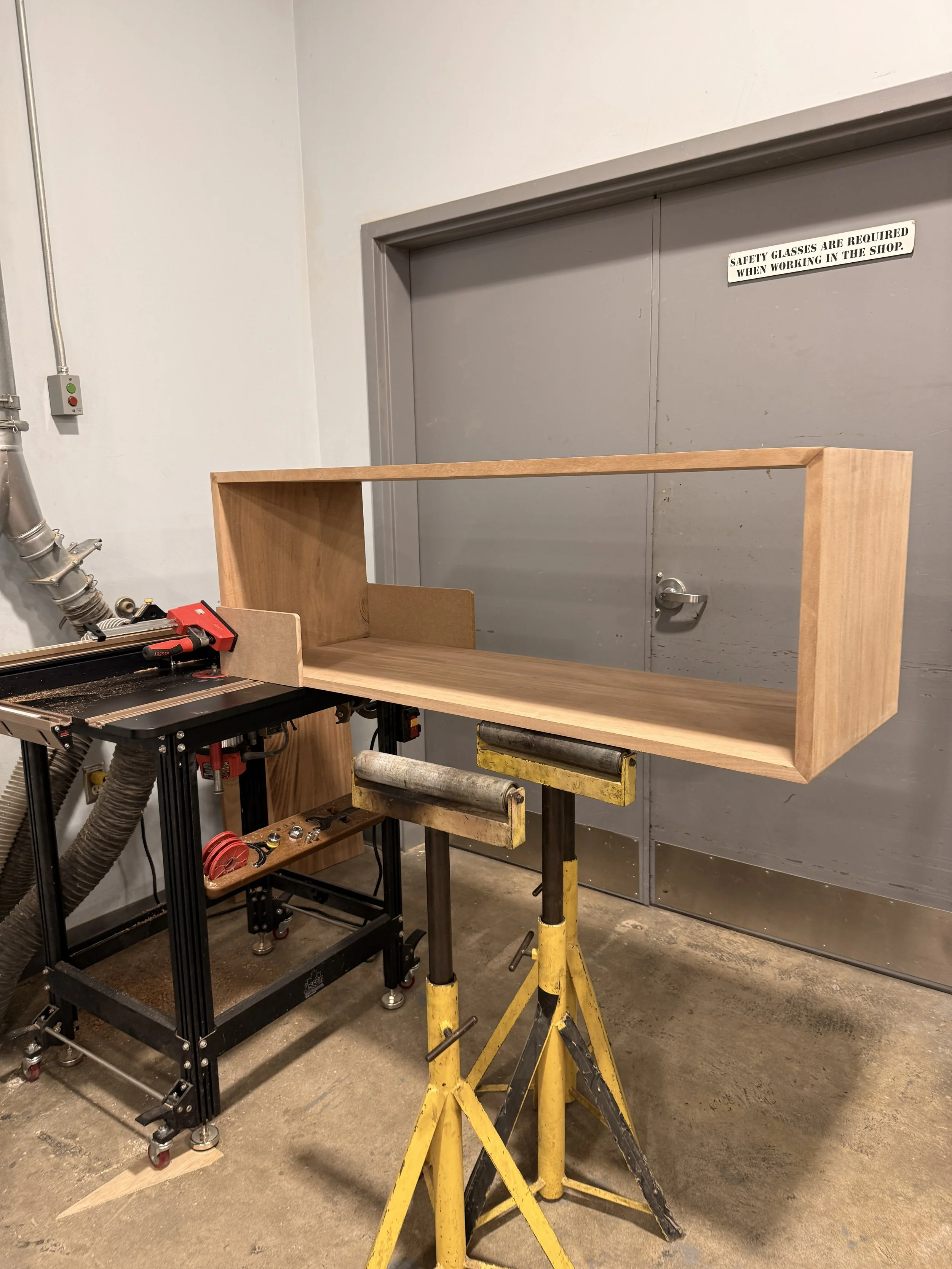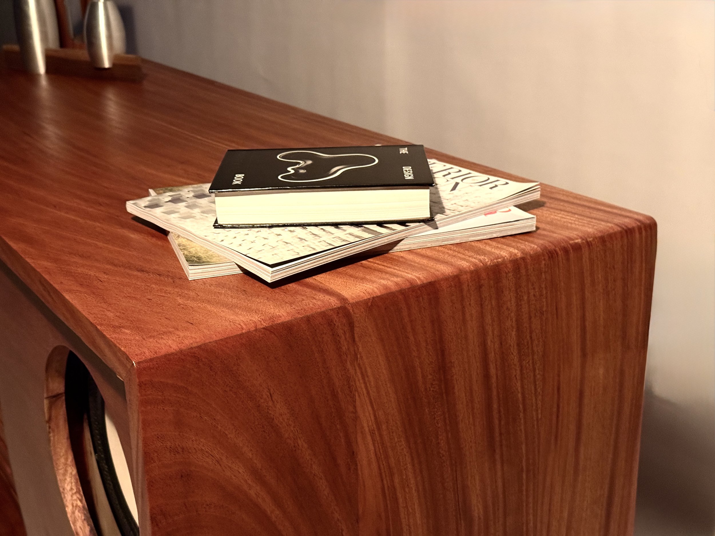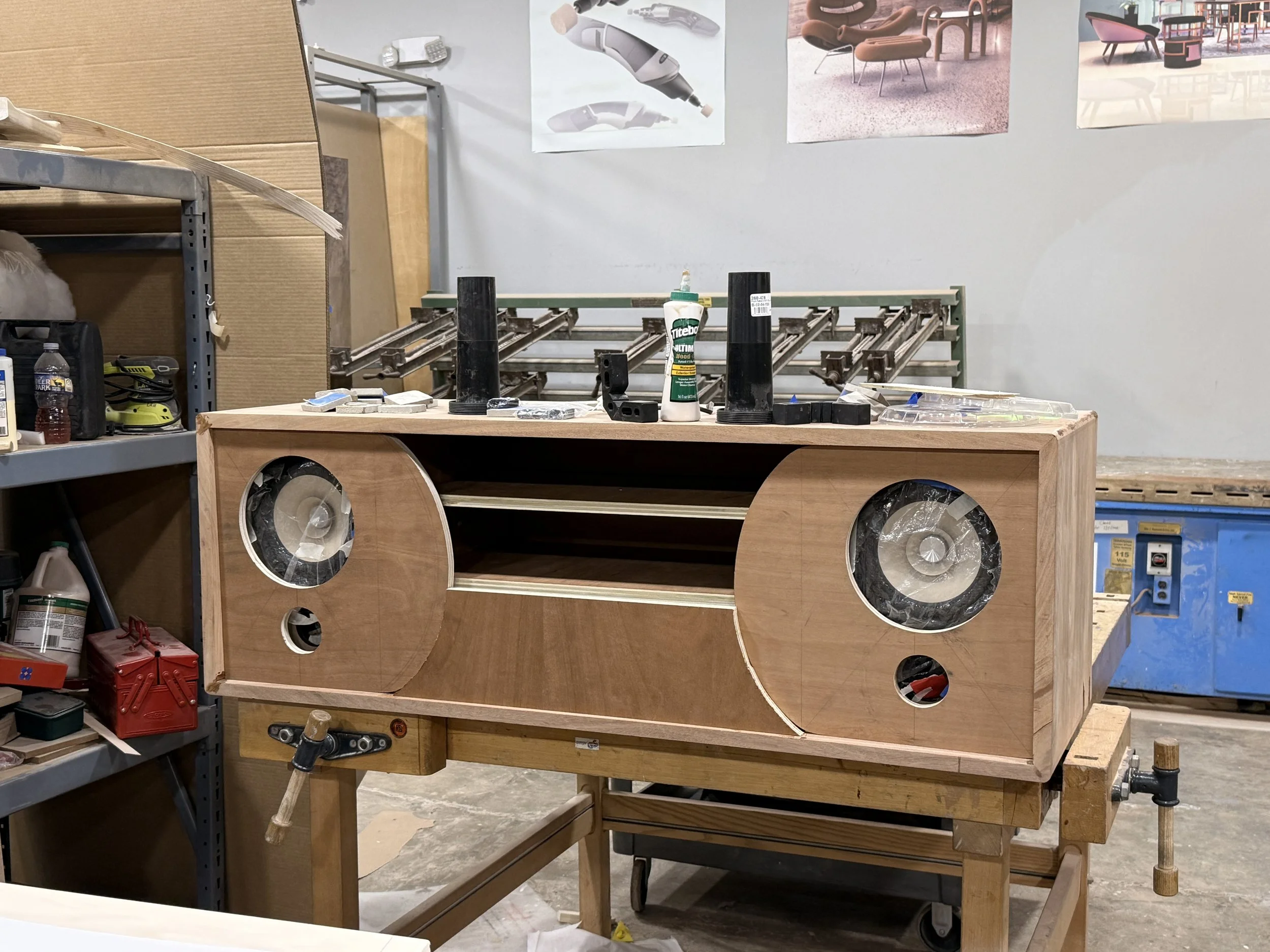 The entire build demanded precision, from ensuring the speaker enclosures were perfectly sized and airtight, to cutting each miter so the waterfall grain could flow seamlessly around the console.